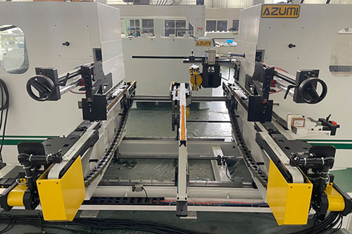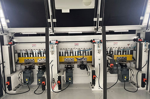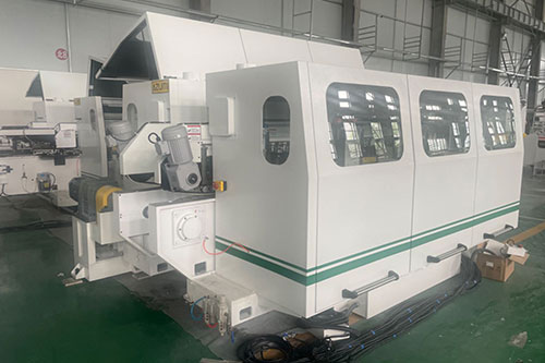 是用來加工地板的端頭榫槽的,他一般分為6軸(實(shí)木)8軸(復(fù)合)10軸、12軸(復(fù)合、鎖扣),除第1軸是跳刀軸與縱銑不同外,其余軸與縱銑略同,刀具與鏈條***小距離,以及上壓緊、輔助壓緊裝置也與縱銑相同。
